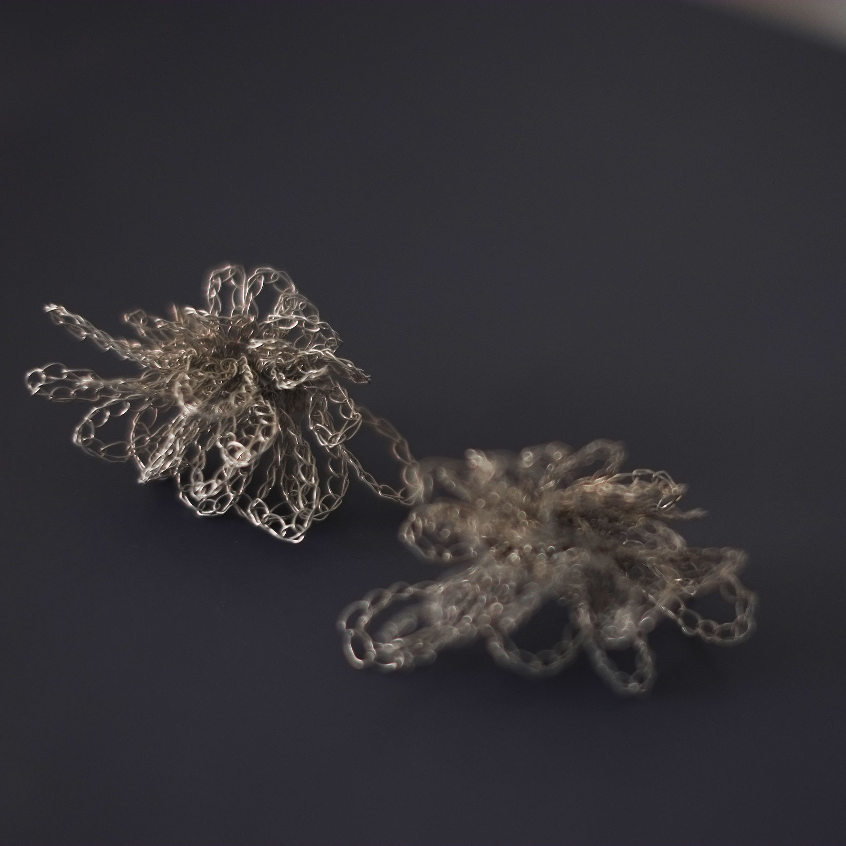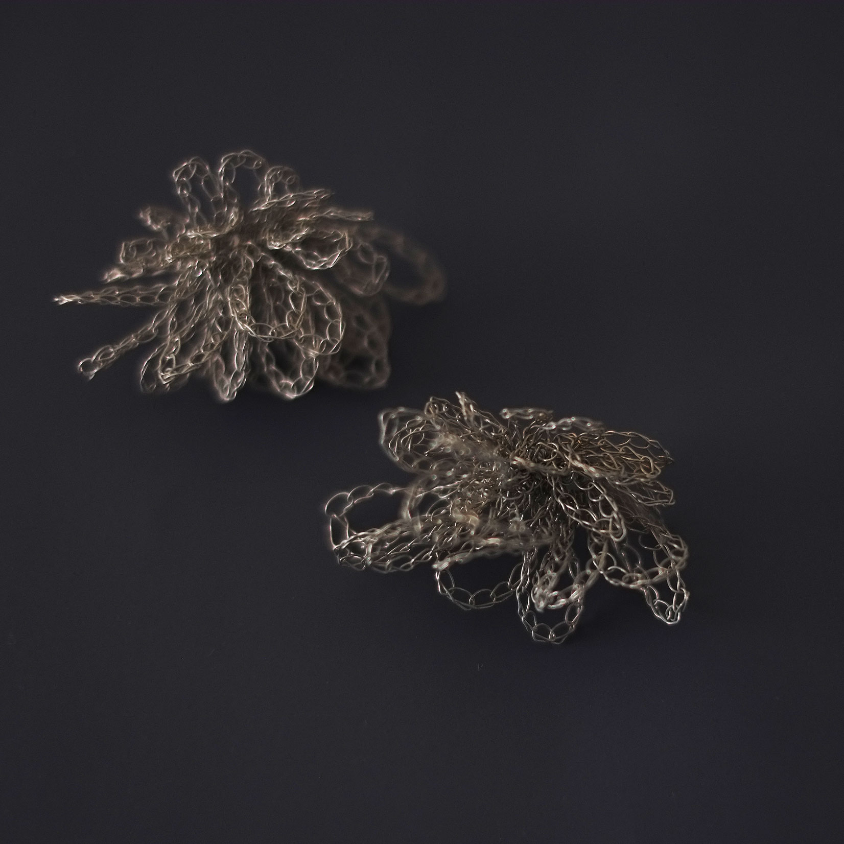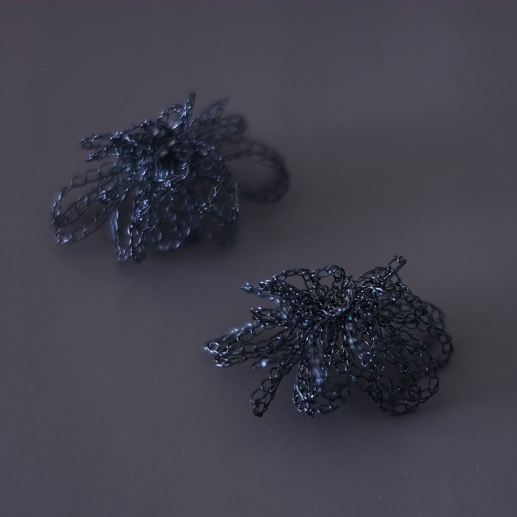 シルバーをかぎ針で編んだあと、セラミック電着塗装を施した作品です。