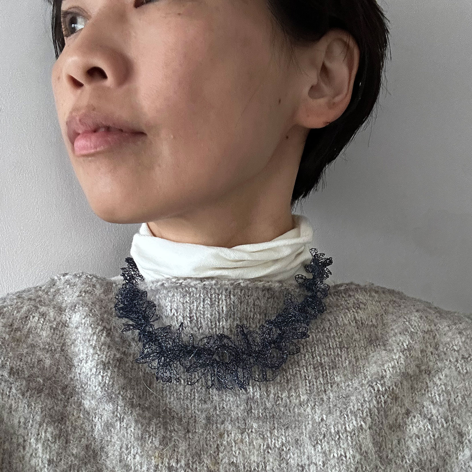 「舞」ネックレスは、繊細なメタルの糸を編み上げて、舞うような軽やかな曲線とリズムを表現した作品です。ひとつひとつ手編みされたループが、不規則ながらも有機的に連なり、見る角度によって様々な表情を見せてくれます。ワイヤーが光を柔らかく受け止め、静かな華やかさを纏う首元を演出します。舞という名前には、“瞬間の美しさ”と“流れるような時間の中での調和”という願いが込められています。