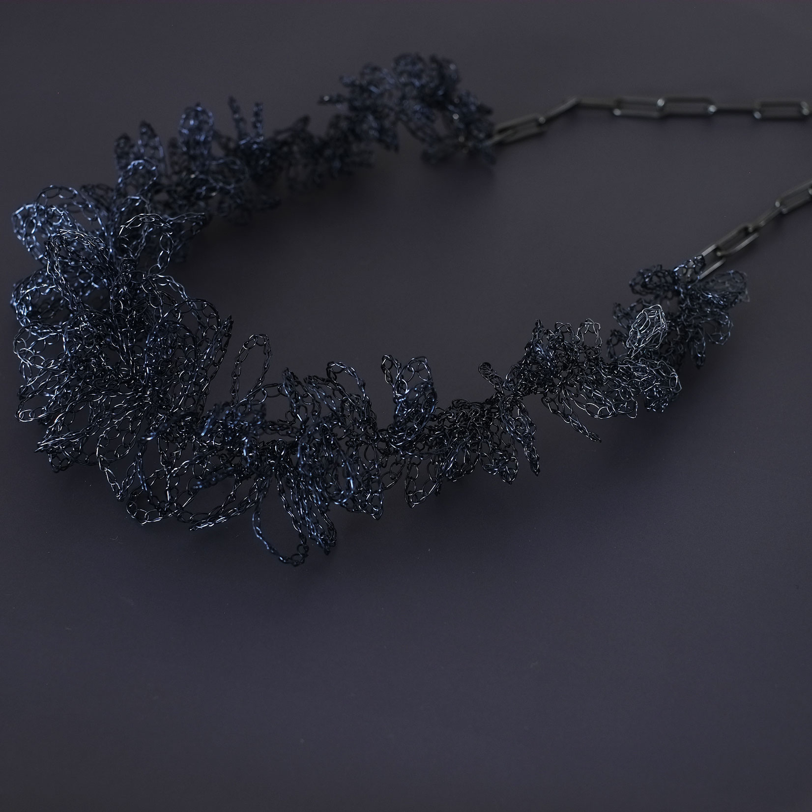 シルバーをかぎ針で編んだあと、セラミック電着塗装を施した作品です。