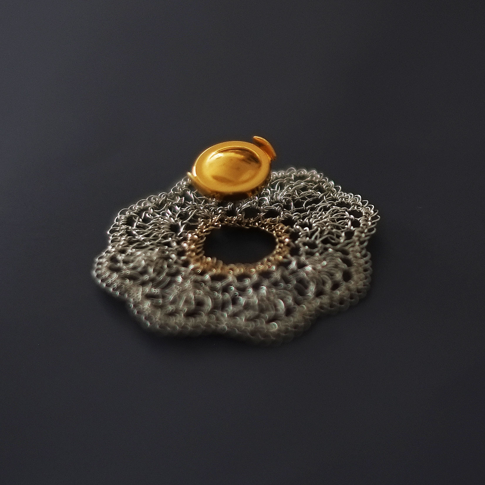 シルバーを使用し、ゴールドフィルドが中心に配されたこのブローチは、デザイナーの熟練した手技によるかぎ針編みで丁寧に作られています。それぞれの線が交わり合う点で、繊細さと強さのバランスが取れており、見る角度によって異なる表情を見せるデザインが特徴です。着け心地とスタイリング