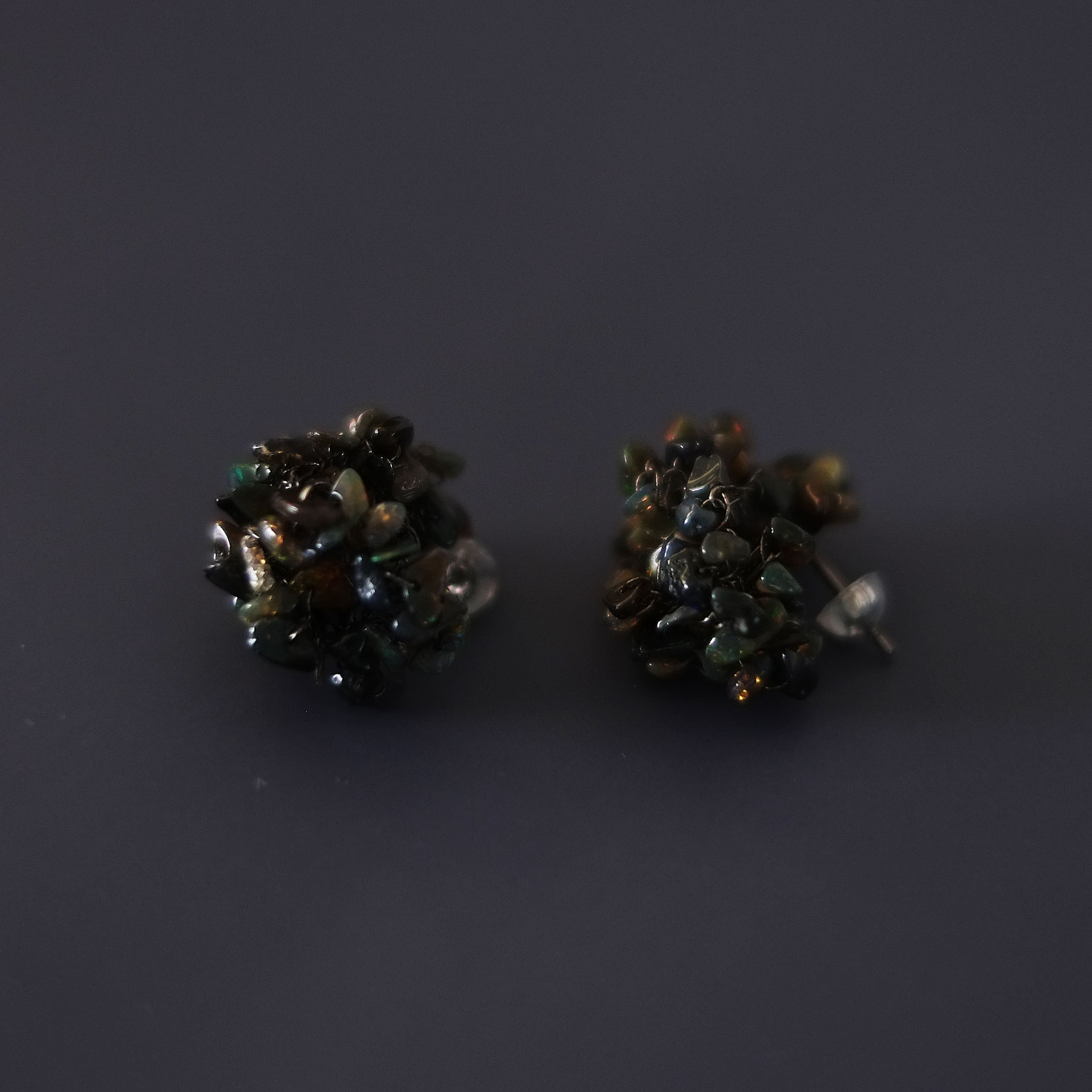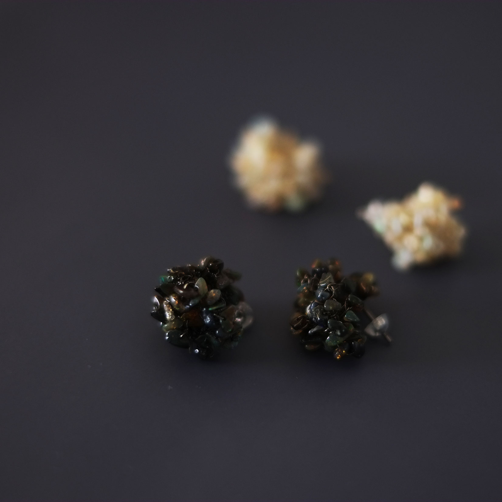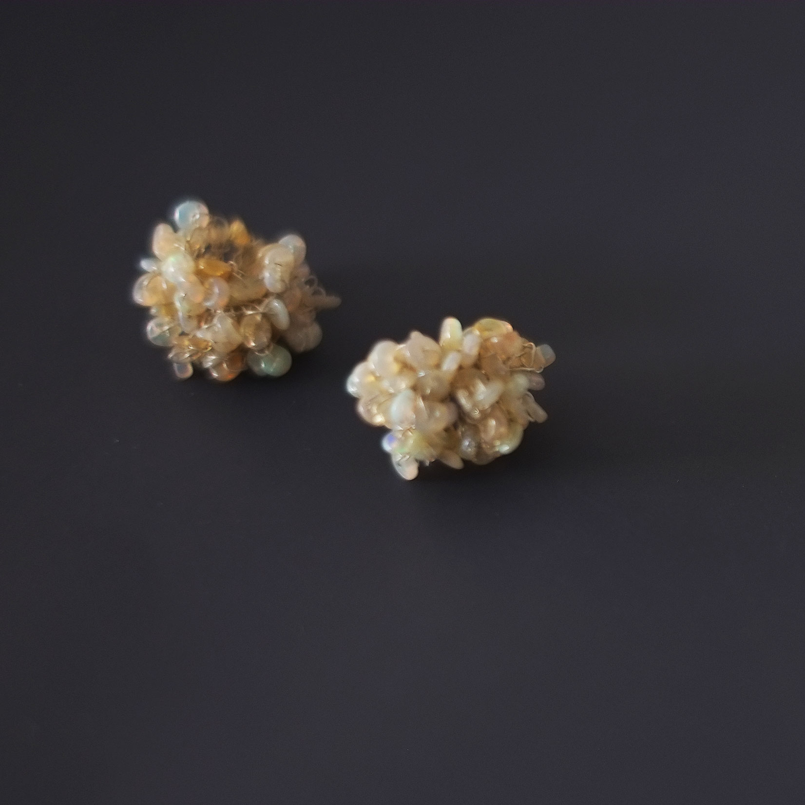 繊細な金属の編み目の中に、ひと粒ひと粒、色合いの異なる天然石(オパール)を編み込むことで、まるで儚く溶けゆく光を閉じ込めたような表情を生み出しています。